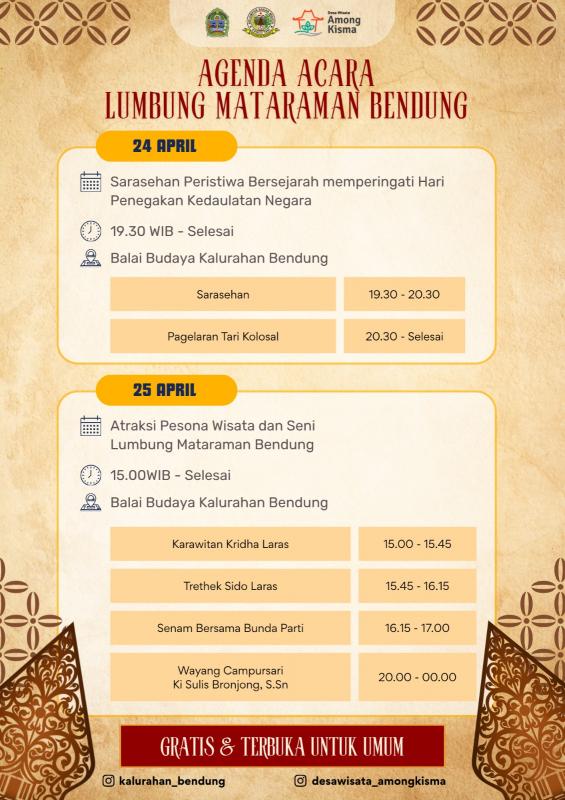 Bendung (SID) Hadir dan saksikan agenda promosi wisata & Budaya Lumbung Mataraman Bendung tanggal 24- 25 April 2026 di Balai Kalurahan Bendung Kapanewon Semin, Adapun ringkasan untuk agenda.